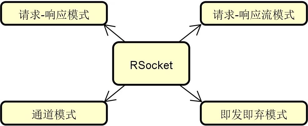 RSocket 以异步消息的方式提供 4 种交互模式,除了请求 - 响应(request/response)模式之外,还包括请求 - 响应流(request/stream)、即发即弃(fire-and-forget)和通道(channel)这三种新的交互模式。