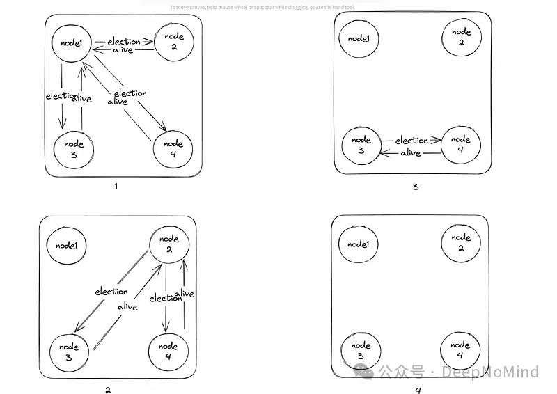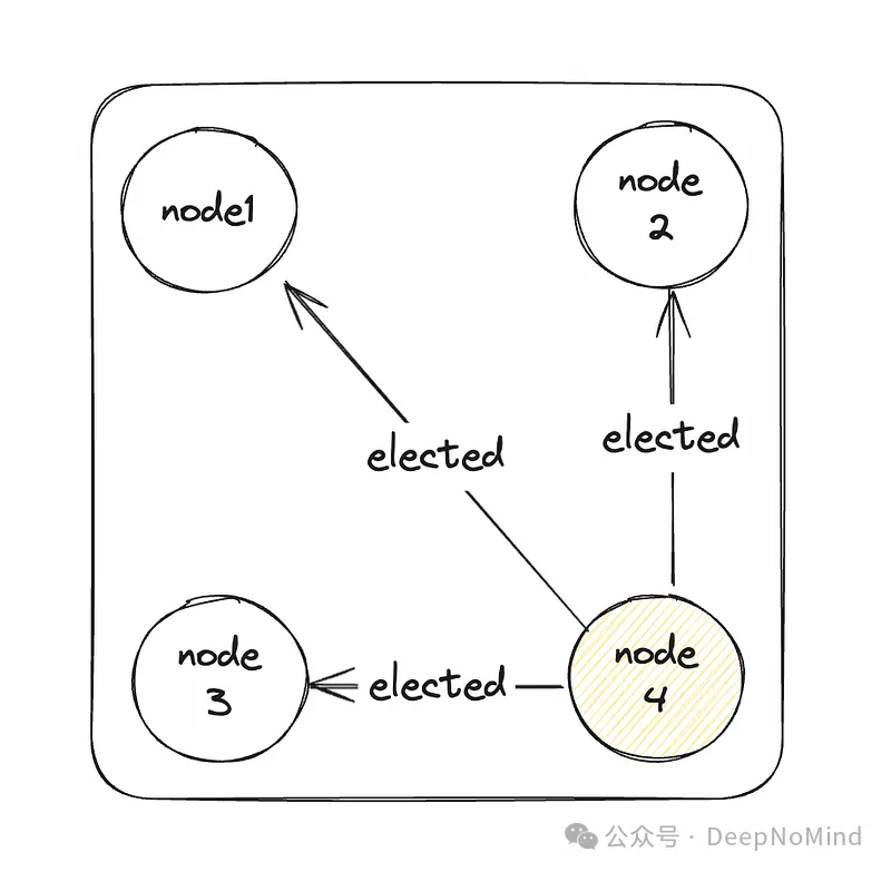 当节点启动时,node4 成为领导者,因为根据其 ID,它的排序最高。在没有领导者的情况下,node4 发起选举,宣布自己为领导者,并广播 ELECTED 消息通知其他节点。