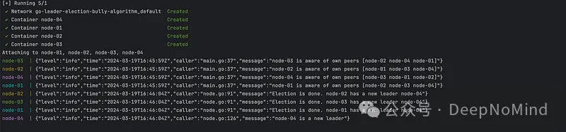 通过 Docker Compose 模拟集群中的节点,每个节点都基于相同的 dockerfile。为了让算法发挥作用,每个节点都需要了解其他节点的情况,这就需要一种服务发现机制。每个节点都被硬编码了其他节点的网络信息,而不是实现完整的服务发现功能。这种简化是为了演示目的。更稳健的实现方式应包括适当的服务发现机制,以动态处理节点的添加和删除。