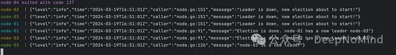 接下来,我们模拟 node4 被终止的情况,观察新的领导者是如何被选出来的。