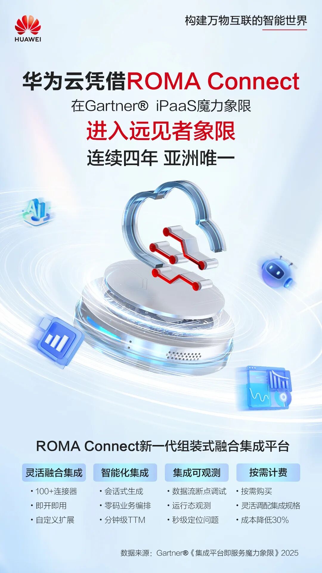 2025年5月19日,Gartner®发布《集成平台即服务魔力象限》报告(Magic Quadrant™ for Integration Platform as a Service),华为云凭借应用与数据集成平台ROMA Connect首次进入远见者象限,成为连续四年亚洲唯一进入iPaaS魔力象限的厂商。