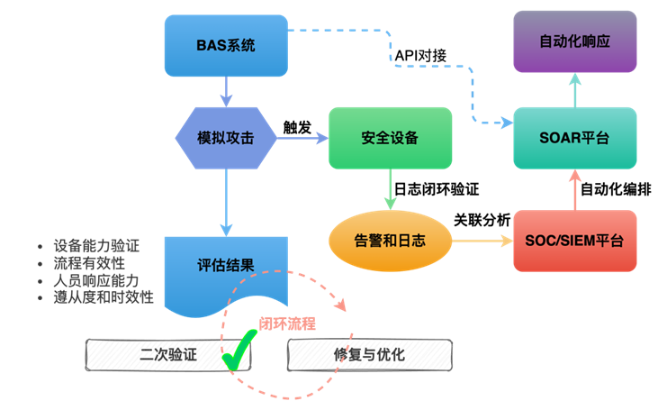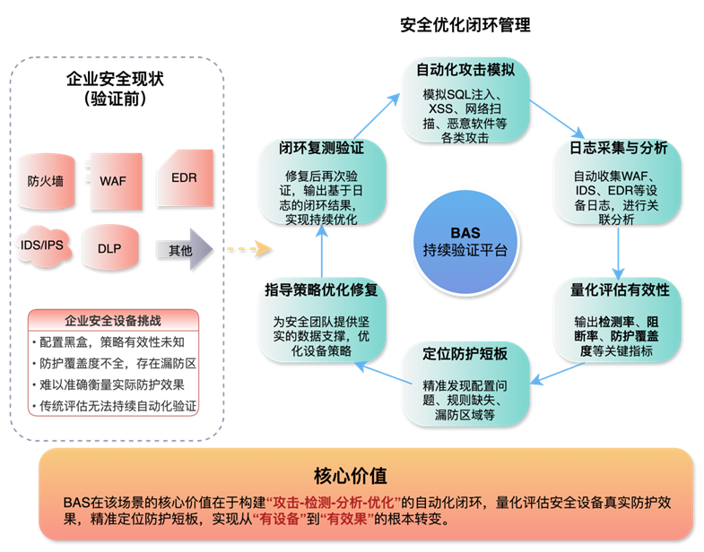 在此场景下,BAS系统全面验证安全产品面对各类威胁的有效性,精准挖掘策略配置问题及防护短板。这不仅能确保安全产品的投入切实转化为防护成果,规避安全产品未发挥效能的困境,还能为安全产品策略的优化和调优提供数据支撑以及真实攻击详情的依据。通过修复后的复测促进闭环验证,进而实现安全优化全流程的闭环管理。