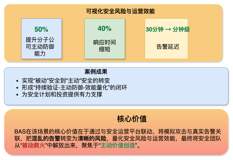在该场景下,BAS系统帮助企业突破了单点防御评估的局限,宏观地把握整体安全态势,变被动溯源为主动发现并组织攻击路径,显著提升了多层防御体系的协同性和效率,对于构建坚固主动的纵深防御体系具有至关重要的意义。