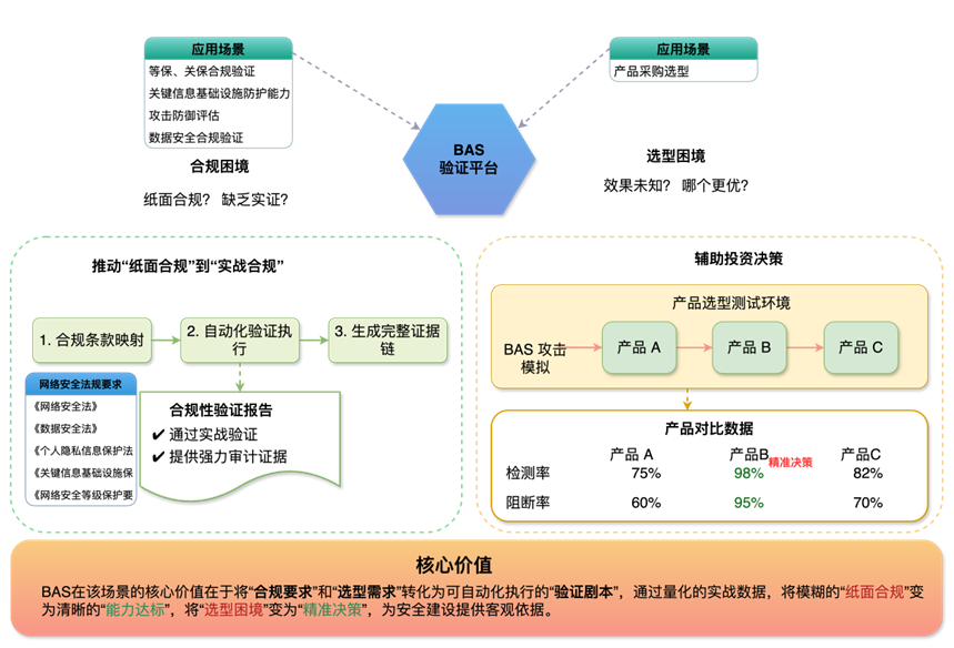 厂商案例绿盟科技在项目中发现安全告警发送延迟了30分钟,通过优化实现缩短至分钟级,提高了安全响应的及时性;墨云科技在案例中通过验证评估防护安全产品,优化后拦截率提升30%,响应时间缩短40%;塞讯科技通过全API自动化方式,将安全验证融入某头部互联网集团的安全运营闭环,通过机器学习样本反哺其SIEM/SOC告警规则,建立了更精准、更有价值的告警与响应机制;矢安科技在某大型金融云项目中,运用自身安全评分模型助力该集团实现统一的安全评价体系,提供指导依据并促使50%以上分子公司从被动安全转为主动安全,大幅提升集团整体安全能力。(数据来源于部分案例,仅供参考,实际效果受多种因素影响)场景四:合规保障与安全产品采购决策