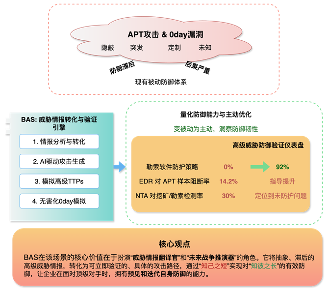 BAS系统凭借威胁情报能力和AI驱动的攻击生成能力,能将APT攻击战术转化为攻击剧本,模拟新型威胁或0day漏洞的复杂攻击行为,同时与相关安全产品深度对接,收集告警日志、流量日志、沙箱分析报告、威胁情报命中日志等,量化APT攻击模拟阻断率、新型威胁防御就绪度等相关指标,如APT攻击模拟阻断率代表对特定APT组织攻击的防御成功率,反映企业对高级威胁的防御水平;新型威胁防御就绪度则评估企业防御体系应对未知威胁的韧性。
