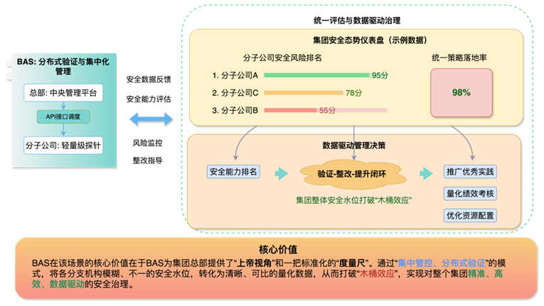 BAS系统支持分布式部署和集中化管理,可在集团总部部署中央管理平台,在各分子公司部署轻量级探针或虚拟节点,进行远程、常态化、标准化的安全验证和评估。针对各分子公司特定业务系统、网络边界和内网环境的攻击(如针对分支机构VPN入口的弱口令爆破、办公网终端的恶意文件投放)进行模拟攻击,并收集各分支机构安全产品的告警日志、阻断日志、审计日志。并通过对分子公司安全风险排名/评分和统一策略落地率等量化指标,直观展现各分支机构的安全短板和优秀实践,便于集团进行资源倾斜和经验推广;或通过统一策略落地率体现集团安全治理能力,确保集团安全政策能够有效渗透到每一个分支机构。在该场景下,BAS系统助力集团总部把握整体安全态势,优化资源配置,提升全集团安全水位。