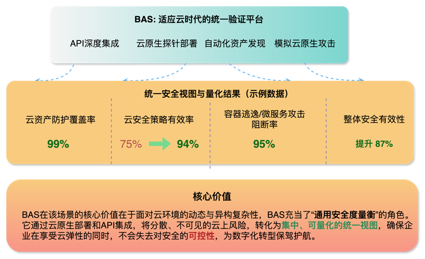 通过BAS模拟针对云主机、云服务(如对象存储、数据库服务)、容器、Serverless等各种云原生组件的攻击,并与云平台API集成,可自动发现云上资产并部署探针,验证云防火墙、云WAF、云安全组、VPC等云原生安全产品的有效性,识别云上配置缺陷,收集云安全平台日志、云资源配置日志、容器运行时日志、云原生安全产品的告警和阻断日志,形成关键量化指标,并通过云资产防护覆盖率可评估云上关键资产被防护的比例,帮助企业发现云上未受保护的资产;通过云安全策略有效率可验证云安全组、VPC等配置的有效性,避免云环境因配置错误导致的安全事件;通过容器逃逸/微服务攻击阻断率可评估企业对容器、微服务等新兴云原生威胁的防御能力。在该场景下,BAS系统助力企业在复杂云环境中实现安全可控,应对新风险,保障数字化转型顺利进行。