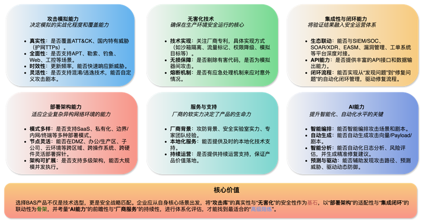 安全牛从攻击模拟能力、无害化技术、集成能力、部署架构能力、服务与支持和AI能力等方面给出了BAS产品选择的通用要求。企业在进行选择时,应从自身安全场景出发,挑选符合场景特点的BAS产品。(详情请见正式报告)