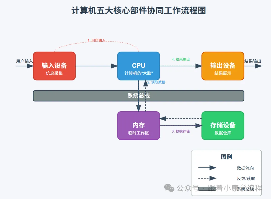 看图就明白了: 信息从输入设备进入,被CPU处理,暂存在内存,需要时保存到存储设备,最后通过输出设备展示给你。整个过程就像一条流水线,数据在各部件间高速流动。