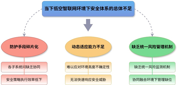 防护手段碎片化,各子系统间缺乏协同,导致安全策略执行效率低下;动态适应能力不足,难以应对低空环境的高度不确定性;面对逐步协同融合的低空智联网,以及在此之上的安全管控体系正在逐步建立的趋势,缺乏统一的风险监测和管理机制。图片