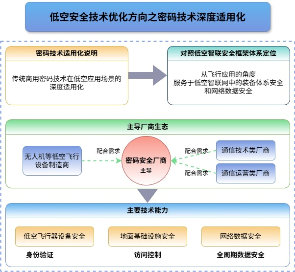 密码技术适用化,主要指的是传统商用密码技术在低空应用场景的适用化。对应低空智联安全框架体系,是从飞行应用的角度服务于低空智联网中的装备体系安全和网络数据安全。该领域由密码安全厂商主导,配合无人机等低空飞行设备制造商、通信类厂商及运营商的需求。主要技术能力聚焦于提高低空飞行器设备和相关地面基础设施的身份验证、访问控制和全周期数据安全能力。