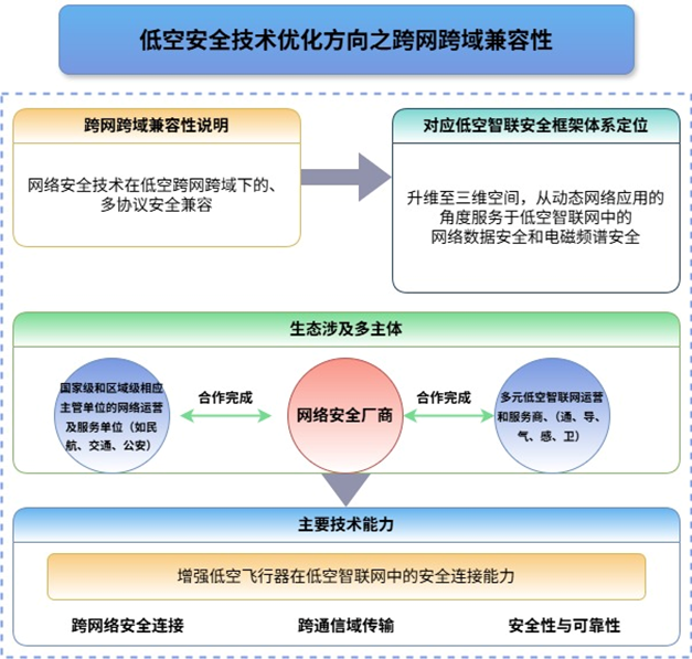 跨网跨域兼容性,主要指的是网络安全技术在低空跨网跨域下的多协议安全兼容。对应低空智联安全框架体系,是打破传统局域网与广域网的概念,升维至三维空间,从动态网络应用的角度服务于网络数据安全和电磁频谱安全。主导生态涉及多类主体,包括网络安全厂商、多元低空智联网运营及服务商(通信、导航、气象、感知、卫星)、国家级和区域级相应主管单位的网络运营及服务单位(如民航、交通、公安)等,主要技术能力致力于增强低空飞行器在低空智联网中跨网络跨通信域中连接和传输的安全性与可靠性。