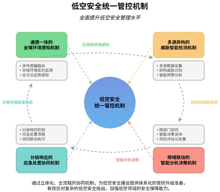因此,未来低空智联网环境下的安全管控技术体系需要全产业链主体的协同共建——在安全认知维度实现思维升维,在顶层设计层面强化系统规划,在工程实施阶段落实标准规范,在运营管理环节构建一体化动态防护,确保全量低空活动运行于安全可控的网络体系中。