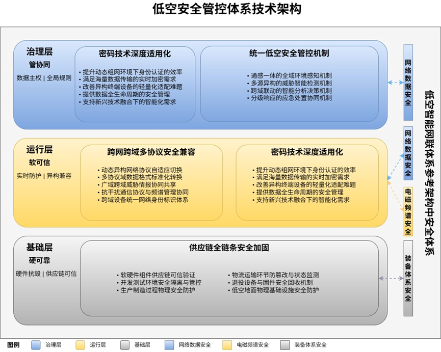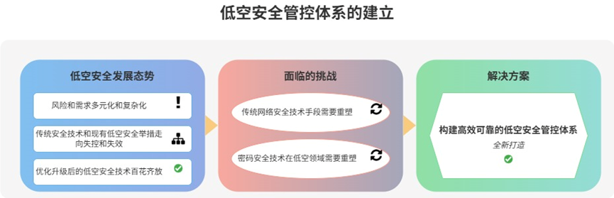 在此背景下,构建一套高效、可靠的安全管控体系尤为重要。传统网络安全和密码安全的技术手段在低空领域都需要重塑,相应的低空安全管控体系也需要全新打造。