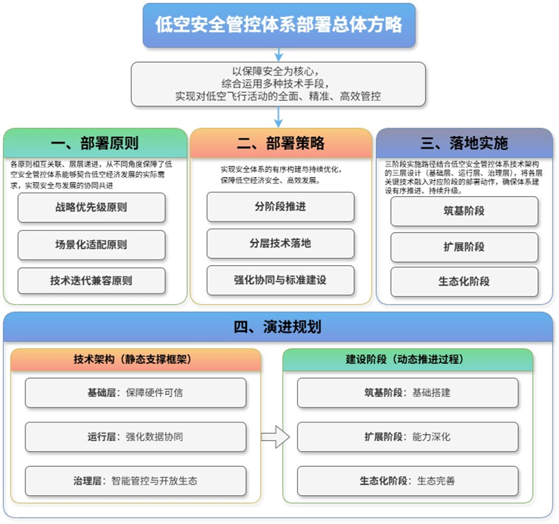 低空安全管控体系的部署对于保障低空经济的健康发展至关重要。低空安全管控体系部署的总体策略是以保障安全为核心,综合运用多种技术手段,实现对低空飞行活动的全面、精准、高效管控,涵盖部署原则、部署策略、落地实施与演进规划等多个关键层面。