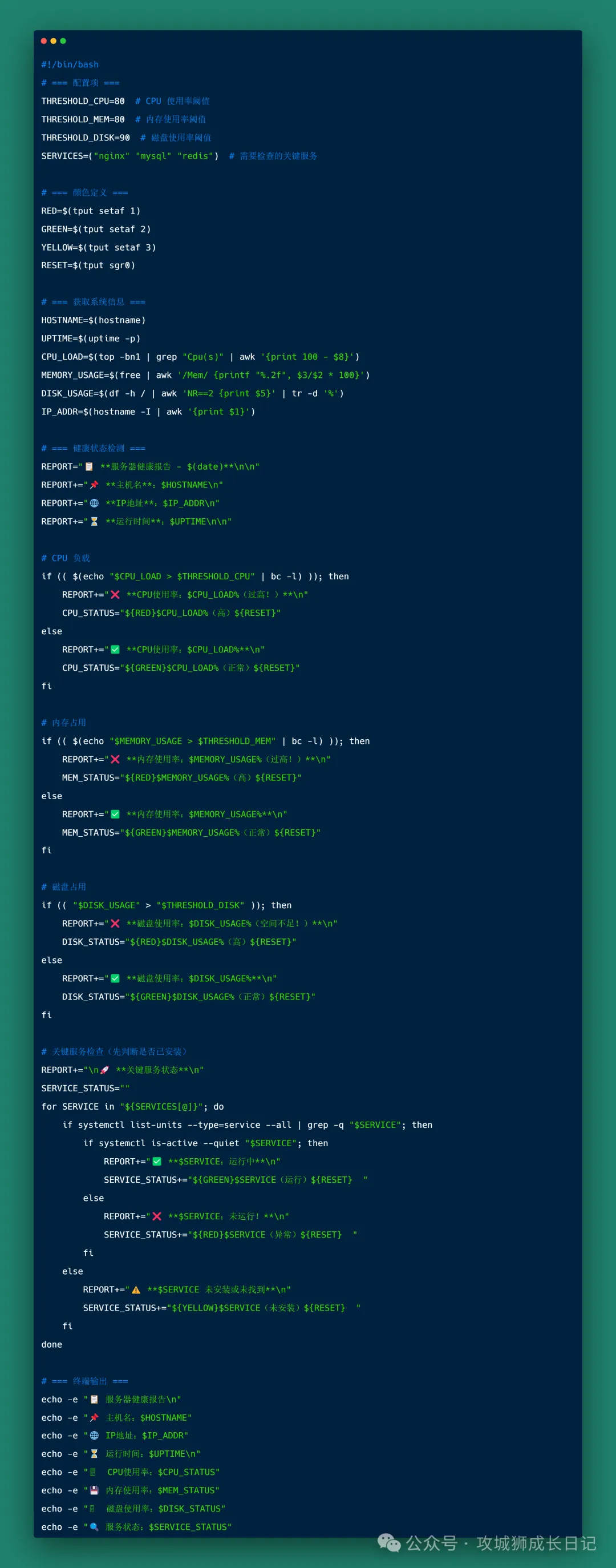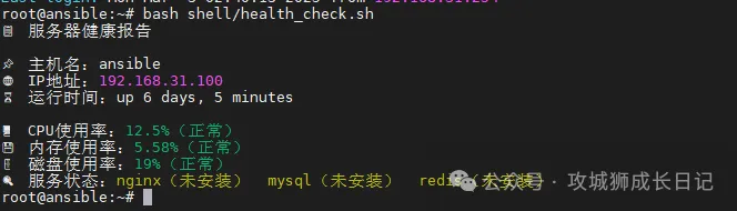 获取 CPU 负载 (top)计算 内存占用率 (free)检查 磁盘使用情况 (df)监测 关键服务状态(systemctl is-active)异常指标标红: