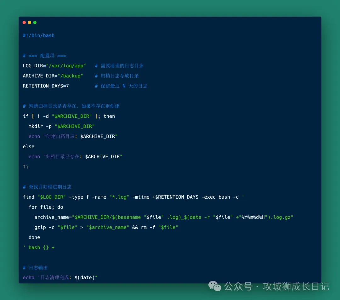 传统rm -rf容易误删重要日志手动清理无法精准控制时间/大小智能清理逻辑: