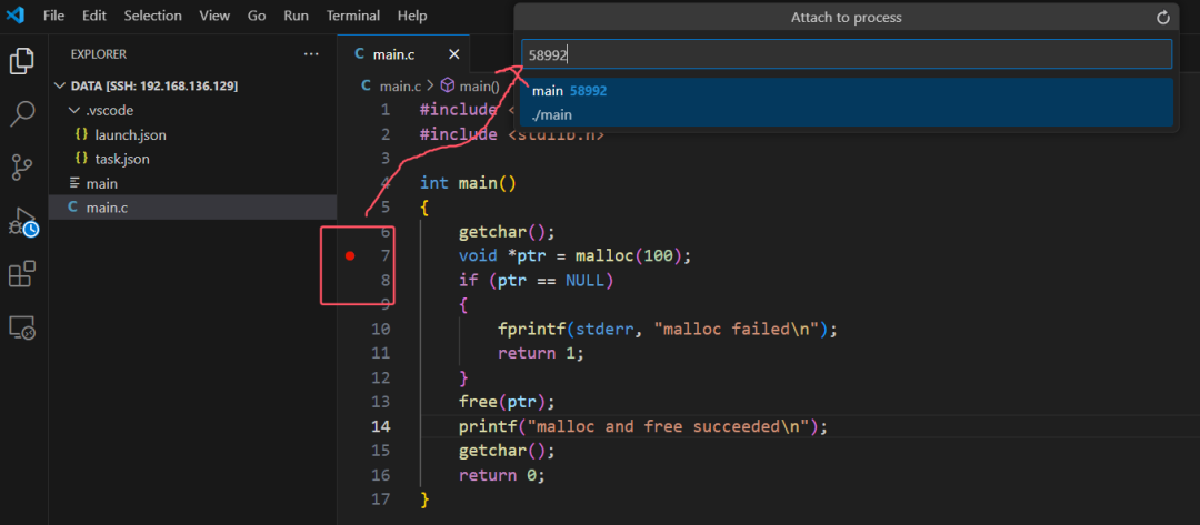 把 main() 函数入口的 getchar() 给注释掉,方便在 malloc 之前通过 attach 附加,为了能够在 vscode 中操作,新增一个对可执行文件可控的 launch.json,内容如下: