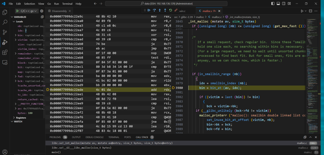 vscode 附加成功后,在 UI 上 Enter 回车过掉 getchar(),单步 F11 调试即可进入 malloc 方法实现,挺有意思的,最后给大家截一张大图: