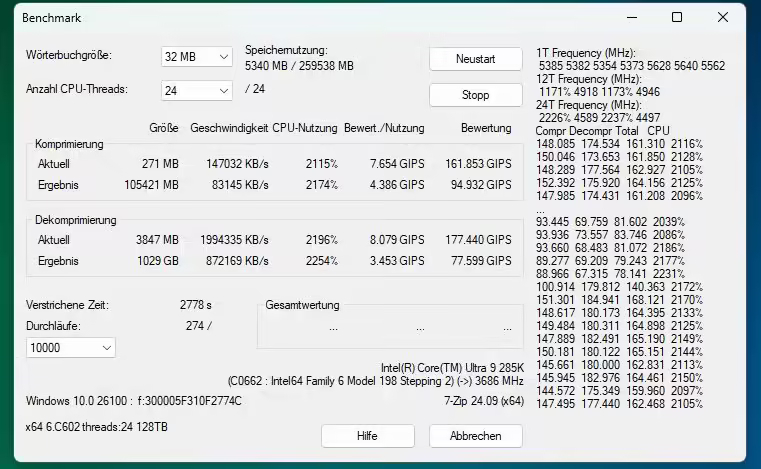 其次是安装 2025 年 2 月更新之后,他使用 7-Zip 和 Prime95 等应用程序测试,发现一旦应用程序失去焦点或最小化,性能就会大幅下降,CPU 频率也会降低。
