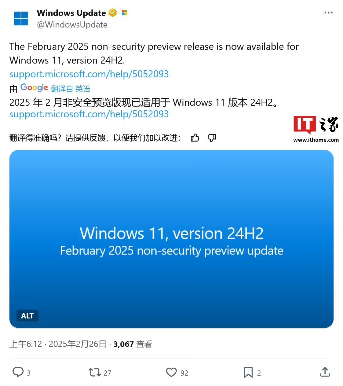 IT之家 2 月 26 日消息,微软公司昨日(2 月 25 日)发布博文,宣布面向 Windows 11 24H2 系统发布 2 月可选更新 KB5052093,用户安装后版本号升至 Build 26100.3323。