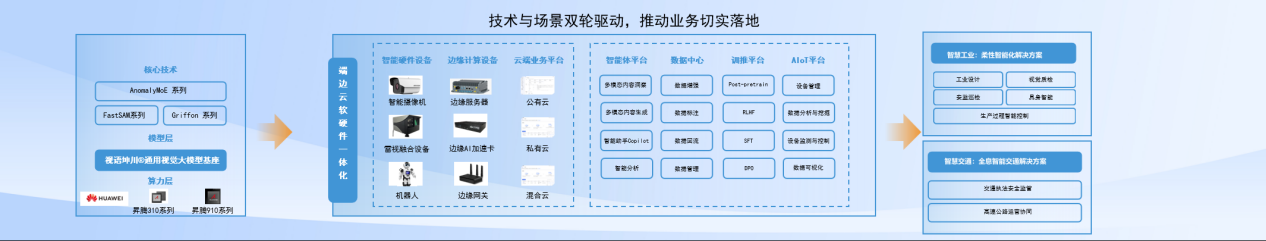 中科视语秉持技术与场景双轮驱动的理念,面向智慧工业、智慧政务、智慧交通等业务领域,推出端边云一体化的智能融合体系,充分发挥视语坤川通用视觉大模型的深度学习能力,结合先进的智能硬件,实现从数据感知、计算推理到业务应用的全链路智能闭环。
