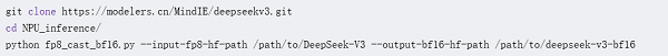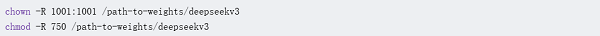 提供的MindIE镜像预置了DeepSeek-V3模型推理脚本,从您信任的来源自行获取权重后,放置在从上述下载的模型代码的主目录下,修改模型文件夹属组为1001,执行权限为750,启动容器。