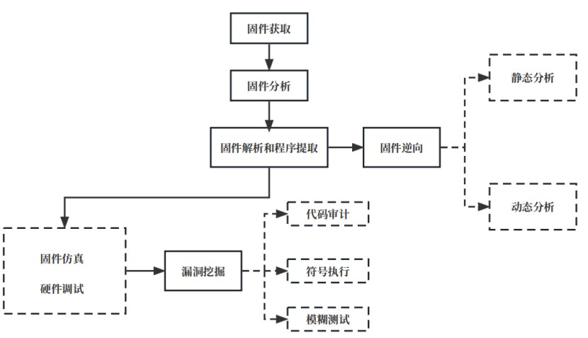 对固件进行研究的整个流程图大致如图1所示,包括固件提取、固件分析、固件解析和程序提取、固件逆向、固件仿真/硬件调试、漏洞挖掘等几部分。