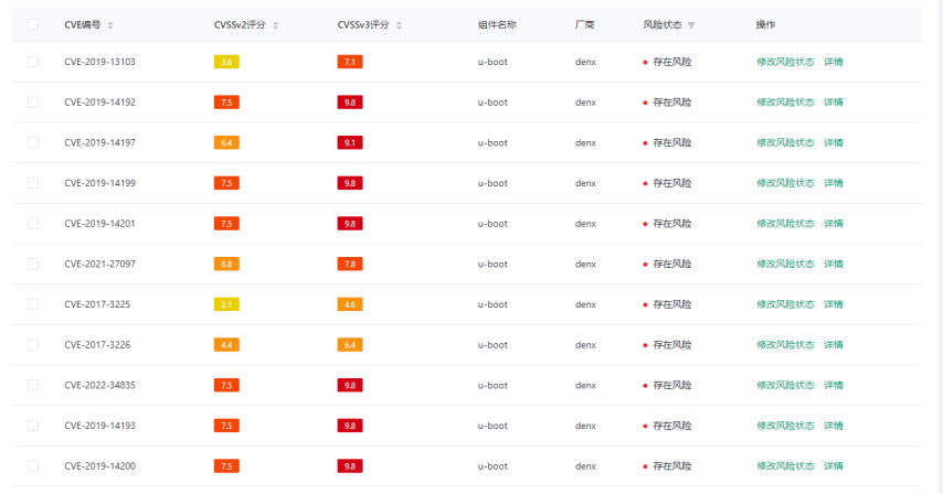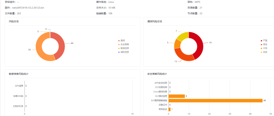 通过固件自动化分析风险评估结合固件脆弱性风险分析,可以针对固件进行综合性风险评估,形成风险评估规范性模板,建立当前固件的风险信息表,输出风险报告,从而对当前所分析固件有更清楚更直观的了解。