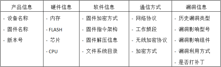 固件中包含了很多研究人员感兴趣的内容,研究人员使用各种方式来对固件进行研究,比如查看厂家对固件的保护,是否封闭了UART及JTAG等引脚,是否从硬件物理上进行了固件内容防护;固件是否加密;固件文件系统是怎么组织的,是否存在直接提取敏感信息的可能性,固件中的各个组件使用的某些通用库是否存在漏洞;固件所支持的某些协议库,例如物联网的一些协议,是否存在漏洞;固件所支持的web服务,密码是否可窃取,是否存在漏洞,例如远程执行,信息泄露等。研究人员对这部分信息进行研究,获取基本的固件信息,对之后的固件安全分析工作来说很有必要,多数情况下,通过对固件分析的前期操作,能获得许多重要的息甚至是发现漏洞。