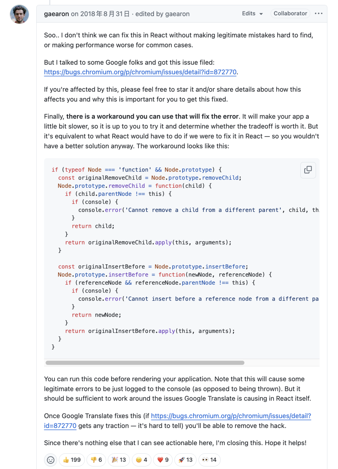 谷歌翻译的干扰还可能导致应用崩溃。当应用试图从DOM中移除一个已被谷歌翻译修改的文本节点时,会抛出一个NotFoundError错误。这是因为当应用试图从 DOM 中移除一个条件渲染的文本节点时,这个节点已被谷歌翻译卸载。