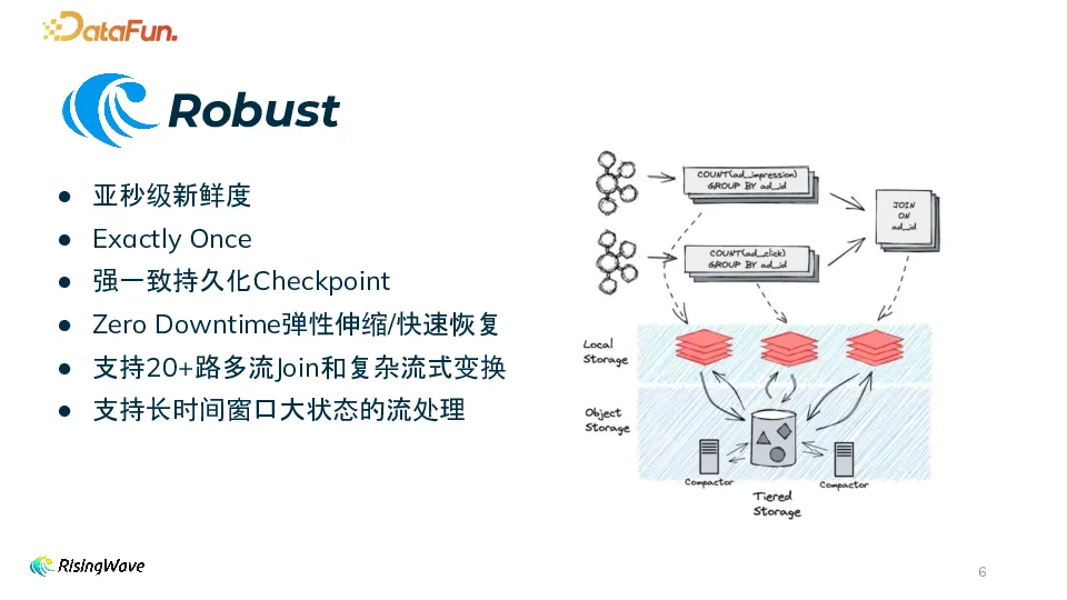 RisingWave 定位为数据库,所以健壮稳定是首要要求。实时性方面,可以达到亚秒级新鲜度,并实现了 Exactly Once。支持强一致持久化 checkpoint,当出现故障时可以立即从上一 checkpoint 恢复。基于存算分离的架构,可以实现 zero downtime 的弹性伸缩和快速恢复。同时,RisingWave 支持 20+ 路多流 join 和复杂流式变换,并且支持长时间窗口大状态的流处理。