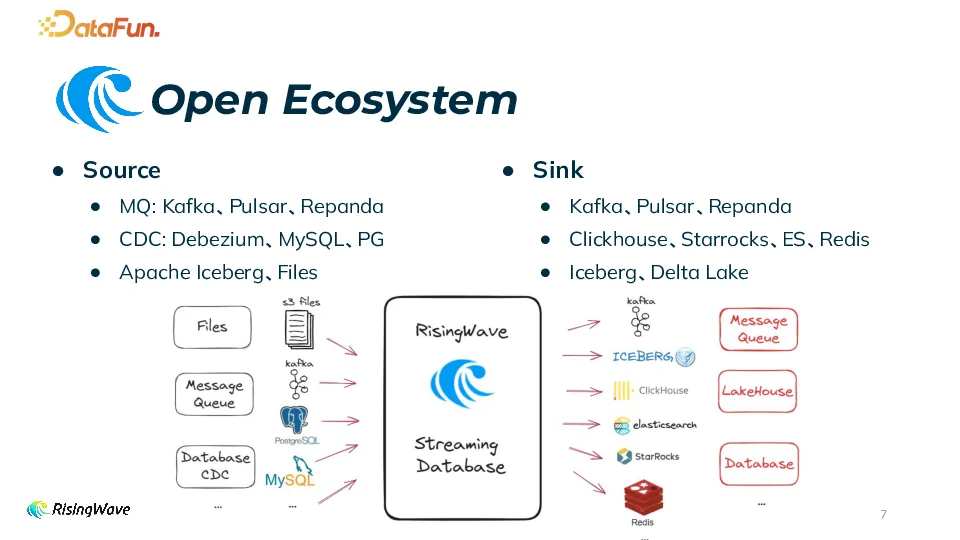 RisingWave 作为流处理系统,具备开放且多元的上下游生态系统。在上游 Source 方面,它支持多种常见的消息队列(如 Kafka 等)、各类数据库的变更数据捕获(CDC),涵盖 MySQL、PostgreSQL、Oracle 等关系型数据库以及 MongoDB 等非关系型数据库,并且支持如 Debezium 等多种 CDC 格式,同时也接纳如数据湖、文件系统内文件等批式数据源。而在下游 Sink,不仅支持消息队列,还支持 ClickHouse、StarRocks 等分析型数据库以及 Elasticsearch、Redis 等非关系型数据库,此外还实现了实时入湖功能。这种开放的生态系统,极大地拓展了 RisingWave 在不同数据场景下的应用范围,使其能更好地融入多样化的数据处理链路中。