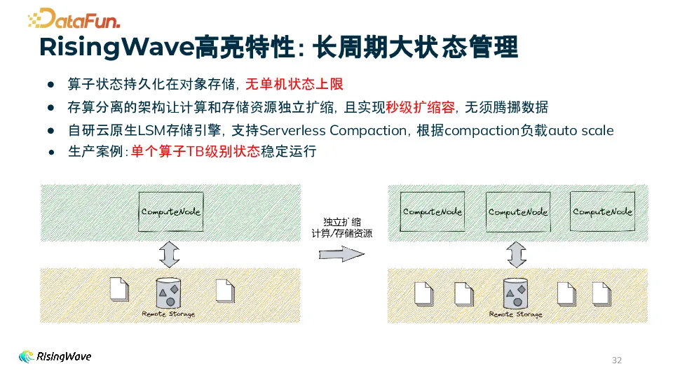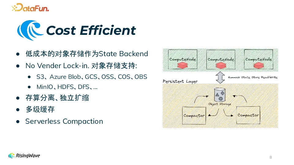 实时计算相比于离线计算通常成本更高,而 RisingWave 通过多种优化,实现了高性价比。首先,使用低成本的对象存储作为存储后端,我们自研了基于 LSM 的存储引擎降低存储成本。RisingWave 支持多种对象存储,比如 S3、Azure Blob 等,也可以自己部署 MinIO、HDFS、DFS。采用存算分离架构,计算和存储可以独立扩缩容。计算节点采用多级缓存,可以根据需求调整,并且支持 serverless compaction。
