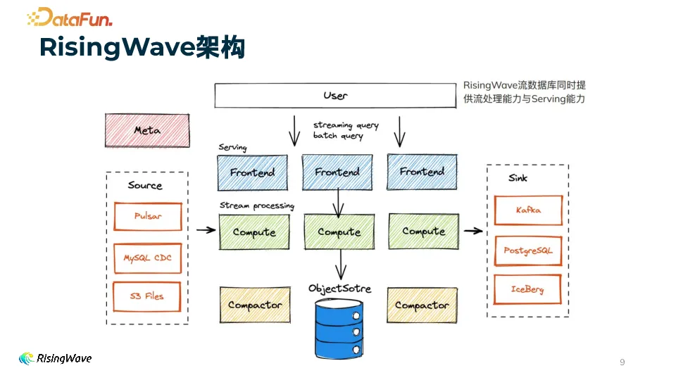 RisingWave 的架构主要分为三层。最上层是接入层(Frontend),它负责解析和优化用户请求,并生成执行计划,这些计划会被分布式调度到第二层 —— 计算层(Compute)执行。在流作业中,有状态的算子其状态会持久化到基于对象存储(ObjectStore)的存储引擎中。在这些组件之上,有一个 Meta 节点负责协调,起到控制器的作用。整体架构体现了 RisingWave 在流处理方面的高效设计,同时兼顾了存储和协调功能。