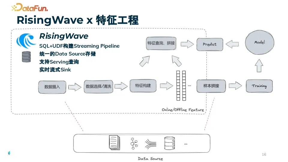 RisingWave 在实时特征工程方面有诸多助力。它能用 SQL + UDF 构建 Streaming Pipeline,提供统一的数据源存储,支持 Serving 查询,并具备实时流式 Sink 功能,能够有效简化和优化实时特征工程的流程,提升效率。