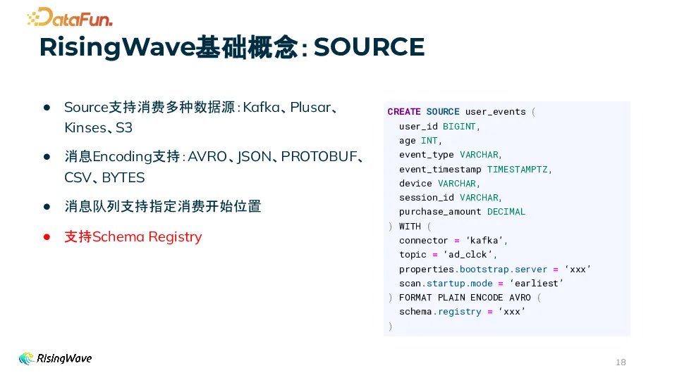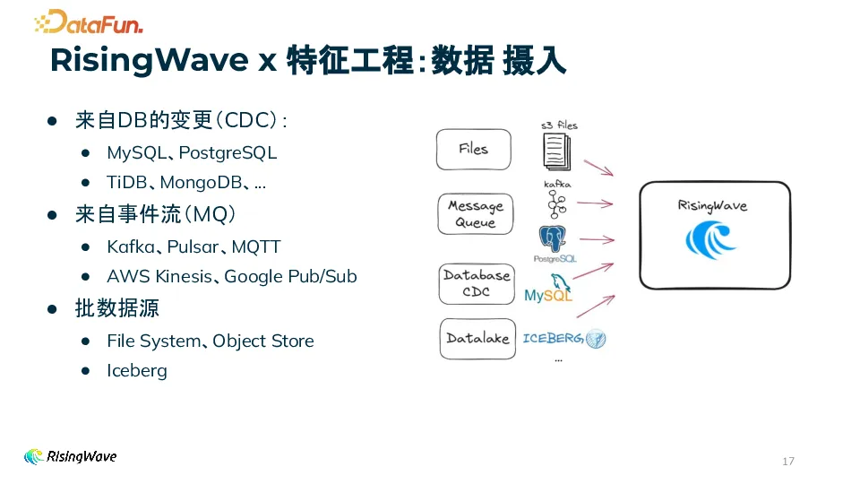 (1)数据摄入在数据摄入环节,RisingWave 中可以使用 source connector 轻松接入多种数据源。