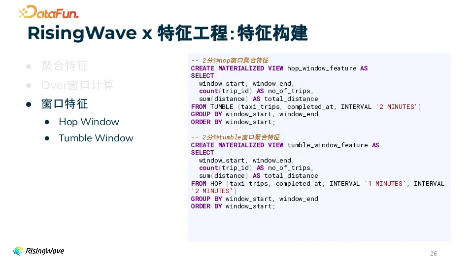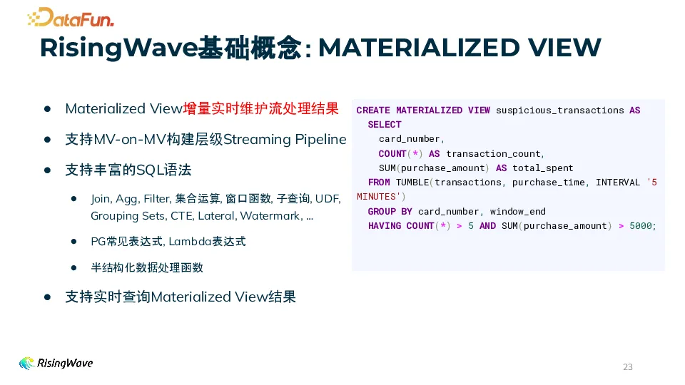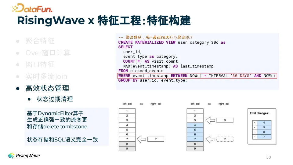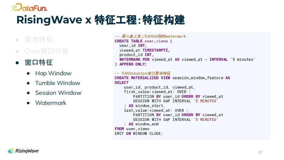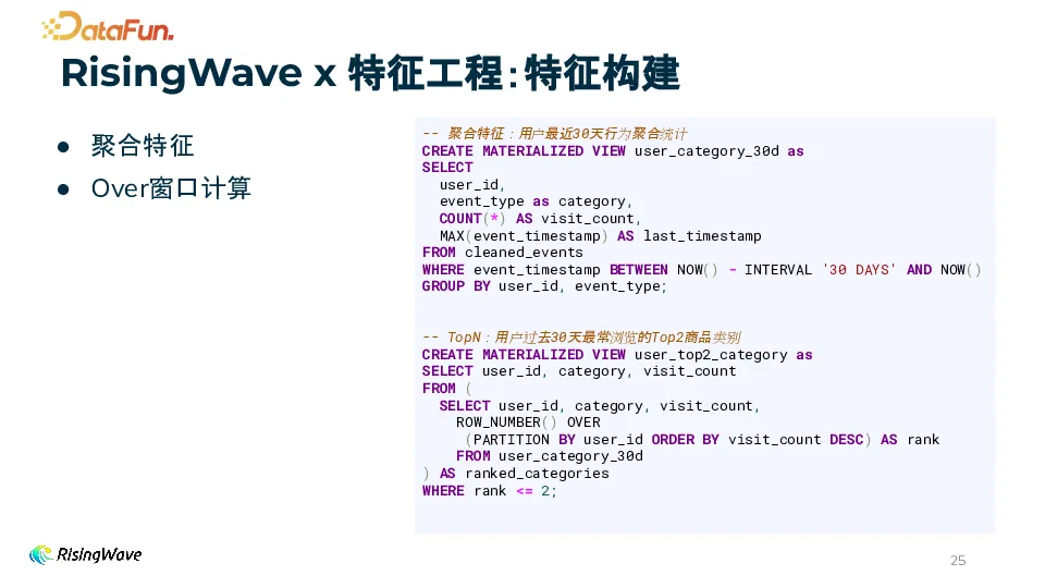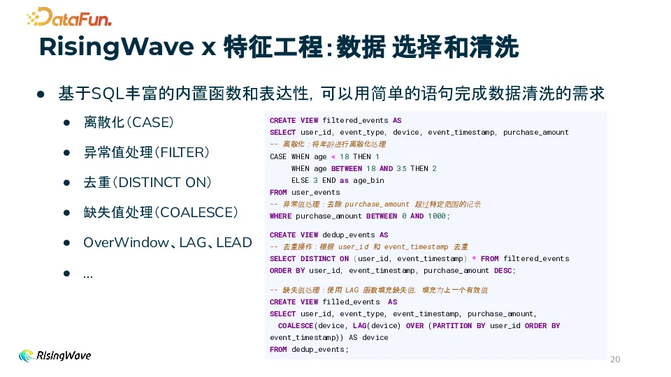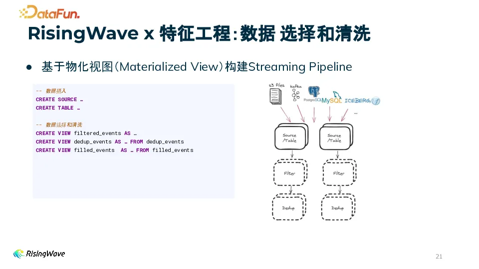 (2)数据选择和清洗在 RisingWave 中,丰富的 SQL 函数可以帮助用户轻松定义数据选择和清洗的逻辑,同时通过物化视图(Materialized View)构建特征工程的 Streaming Pipeline。