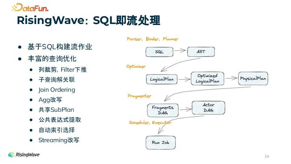 支持 MV - on - MV 构建层级化的流处理管道,可以堆叠物化视图来构建多层级的流处理流程。物化视图支持丰富的 SQL 语法,包括 JOIN、窗口函数、子查询、分组等,还支持高级的流处理特性如 watermark,以及半结构化数据的处理函数。物化视图的结果是实时可查询的,用户可以通过 SQL 查询来获取物化视图的结果,方便进行数据验证和调试。RisingWave 中的 SQL 即流处理具有诸多优势。它基于 SQL 构建流作业,具备丰富的查询优化功能,如列裁剪、Filter 下推等。还支持子查询解关联、Join 重排序等操作,能够将用户编写的 SQL 优化成高效的分布式流作业,方便用户操作。