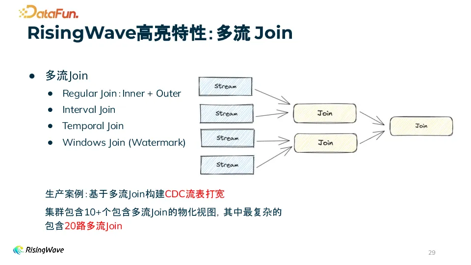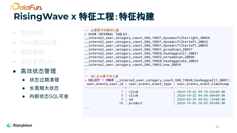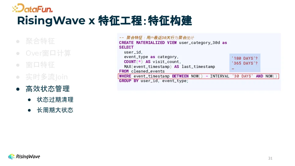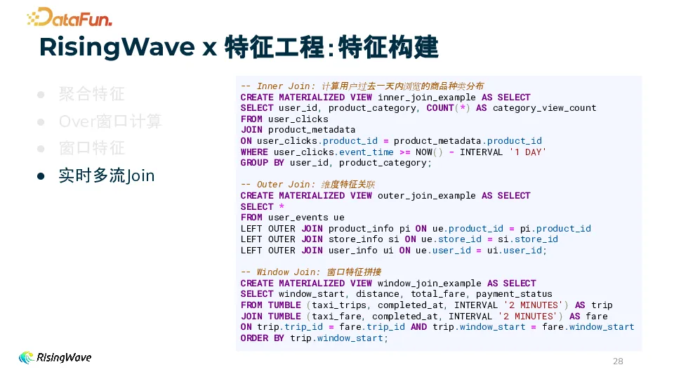 1)聚合特征和 Over 窗口计算通过 CREATE MATERIALIZED VIEW 语句实现,例如计算用户最近 30 天行为聚合统计,从清洗后的数据表(如 cleaned_events)中筛选出特定时间范围内(NOW() - INTERVAL 30 DAYS到NOW())的数据,按用户 ID(user_id)和事件类型(event_type)进行分组,计算访问次数(COUNT())和最后访问时间(MAX(event_timestamp))。还可进一步计算如用户过去 30 天最常浏览的 Top2 商品类别,先按用户 ID 分区并按访问次数降序排序,然后选择排名前 2 的类别。实时多流 Join 是 RisingWave 的一个高亮特性,除了上面介绍的 Regular Join 和 Interval Join,还支持 Temporal Join,以及基于 Watermark 的 Windows Join。多流 Join 是流处理中的一个难点,而 RisingWave 凭借其架构优势和丰富的优化,让用户在不感知调度和实现细节的情况下,可以轻松通过 SQL 构建包含多流 Join 的实时特征。