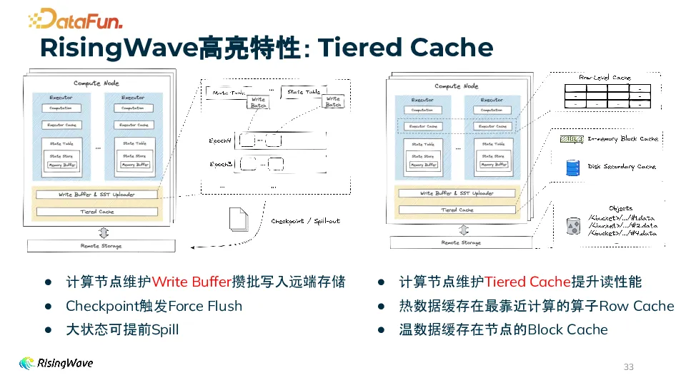 在 RisingWave 中做了大量工作去优化状态远端存储带来的延迟。通过多级缓存机制,用户可以根据实际场景在性能与成本间做出权衡。