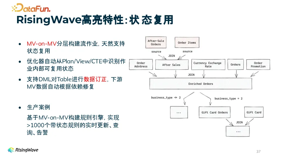 特征工程中,Source 数据清洗后的原始数据可以会物化成 MV,基于这些 MV 又可以创建不同的下游 MV,MV 之间还可以 join,这样分层构建流作业,天然支持状态复用。Source Table 支持 DML 进行数据订正,订正引起的变更会自动地同步到各个下游。