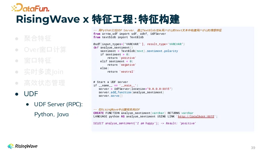 支持通过 CREATE FUNCTION 和 CREATE AGGREGATE 方式定义 UDF。