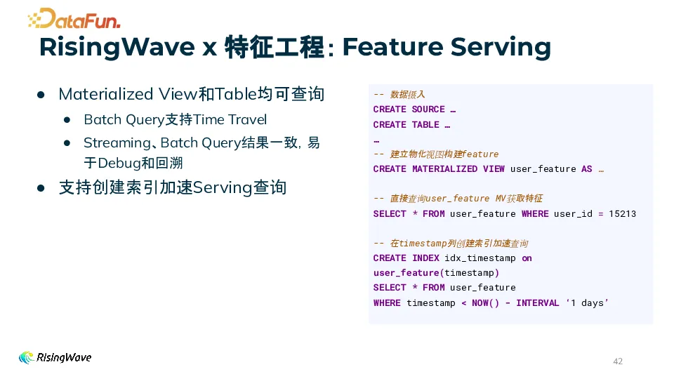 1)查询与结果一致性可查询性Materialized View 和 Table 均可查询,支持 Batch Query 和 Streaming Query。用户可以通过 SELECT 语句直接查询物化视图(如 user_feature)获取特征数据,例如查询特定用户 ID(user_id = 15213)的特征。这种查询方式方便快捷,能够满足不同场景下对特征数据的获取需求。结果一致性与调试回溯Streaming 和 Batch Query 结果一致,这一特性使得用户在开发和调试过程中更加便捷。用户在创建物化视图前可以先运行 Batch Query 来查看结果是否符合预期,进行数据验证和逻辑调试。如果发现问题,可以方便地回溯和排查,因为两种查询方式的结果具有一致性,保证了数据的可靠性和可追溯性。支持创建索引加速 Serving 查询支持将数据变更 Sink 到下游系统。