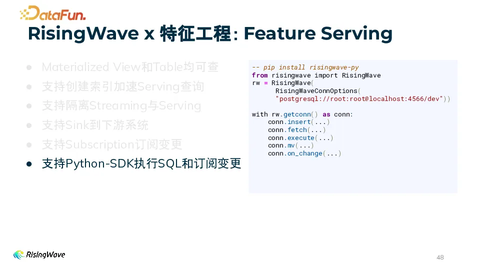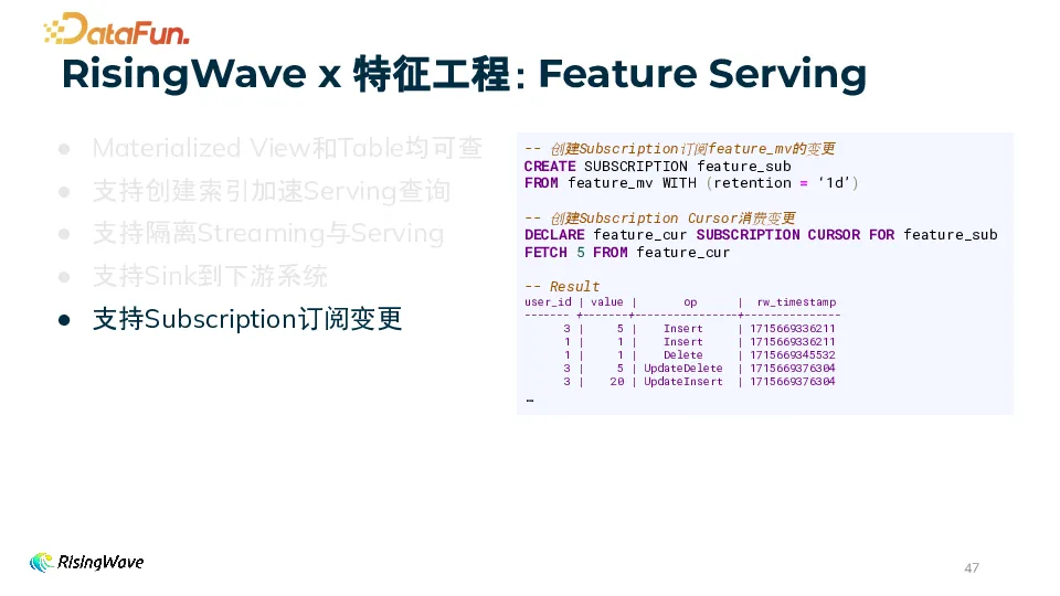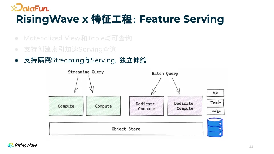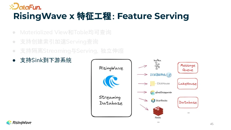 在 RisingWave中,Feature Serving 是实时特征工程的重要组成部分,提供了强大的功能用于特征查询、数据分发和服务优化。