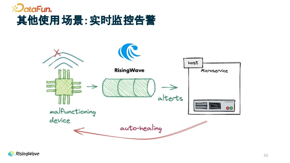 用户借助 RisingWave 实时处理数据,一旦监测到如设备故障等异常情况,便能迅速发出告警,实现自动修复或及时通知相关人员处理。