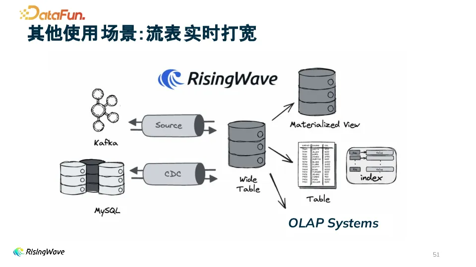 当上游存在多个不同数据源的数据表时,RisingWave 可将这些表整合打宽成一张大宽表,以便在数据库中生成报表或进行深入分析,为决策提供全面的数据支持。