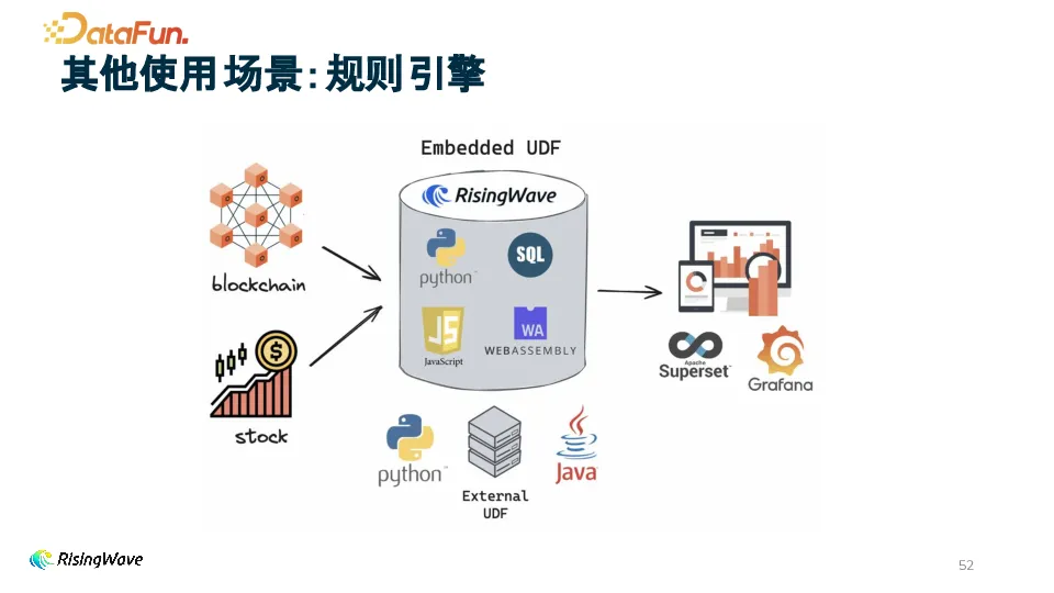 (1)易用性RisingWave 通过 SQL 作为交互接口,兼容 PostgreSQL 协议,用户通过简单的 SQL 即可实现复杂的实时需求,同时支持通过不同语言的 UDF 进行拓展。另外,RisingWave 不仅仅是流式计算引擎,而且带有自研的存储引擎,除了支持有状态的复杂流计算外,实时分析的结果可以以物化视图的方式通过 SQL 在 RisingWave 中查询,我们称其为 Serving。同时 RisingWave 流算子的内部状态都抽象成了关系型表,也可以通过 SQL 查询,大大提升了流计算的可观测性。