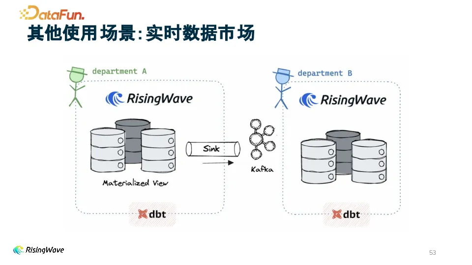 不同部门利用 RisingWave 构建物化视图,维护数据的可见性与权限。借助 dbt 工具,清晰管理数据血缘,保障数据质量与可追溯性,促进部门间高效的数据协作与共享。