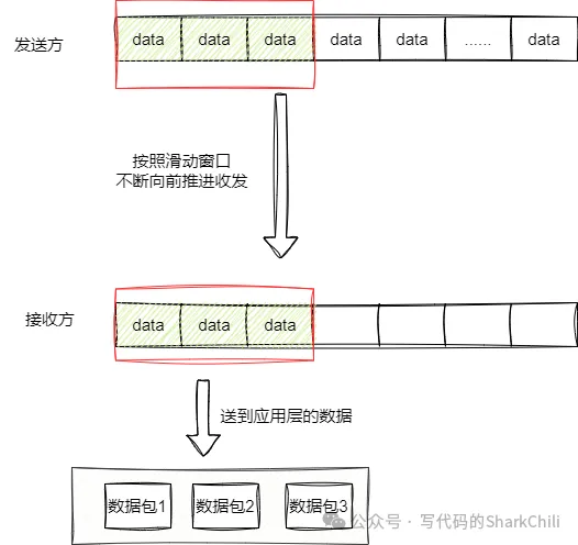 先来说说socket缓冲区和滑动窗口的共同作用,我们都知道TCP是全双工、面向流的协议。这意味发送时必须要保证收发正常,所以TCP就提出了一个滑动窗口机制,即以滑动窗口的大小为单位,让双方基于这个窗口的大小进行数据收发,发送方只有在滑动窗口以内的数据才能被发送,接收方也只有在窗口以内的数据被接收和处理,只有接收方的滑动窗口收到发送方的数据,且处理完成并发送确认信号ACK之后,发送方的窗口才能继续向后移动: